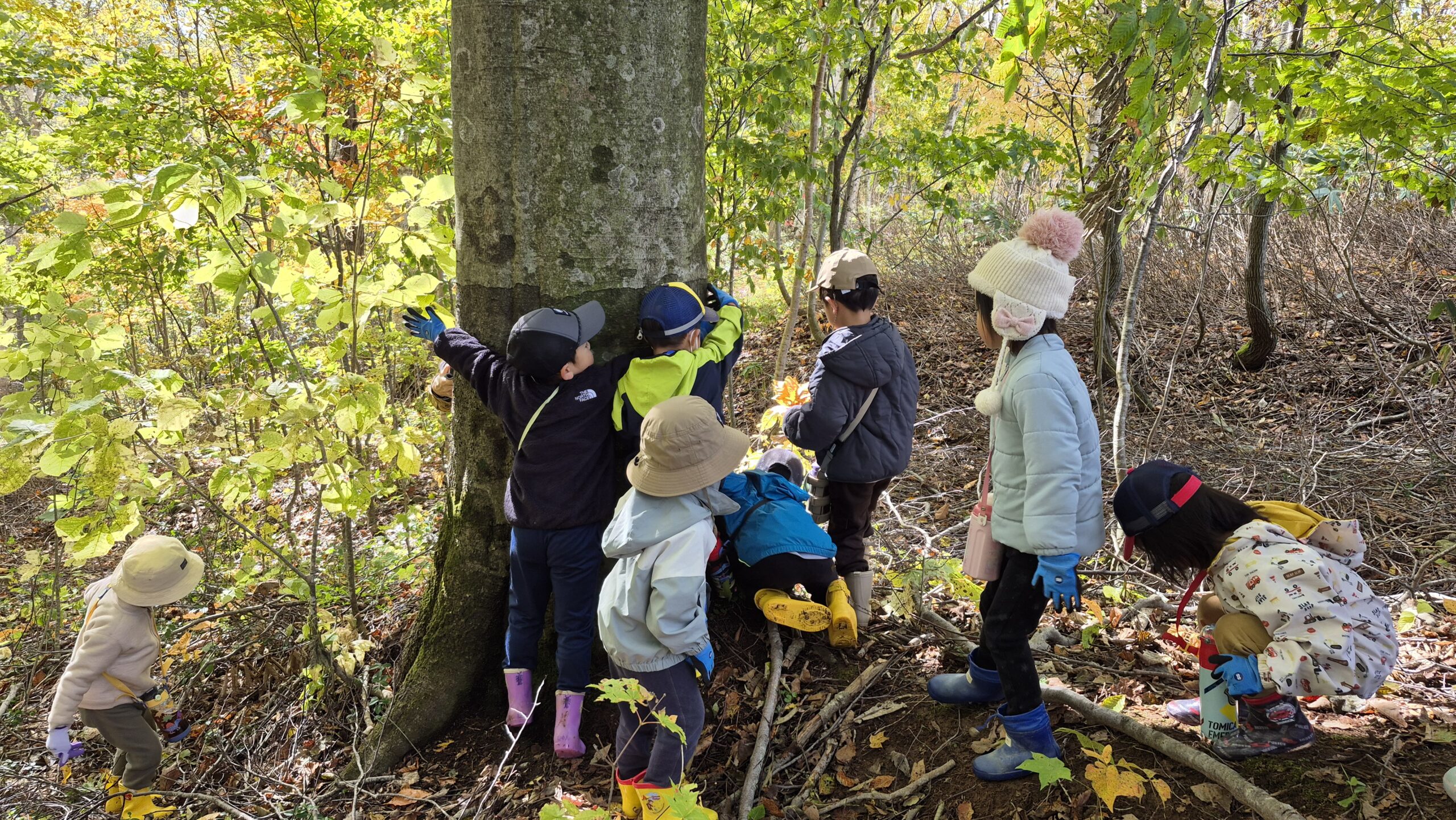 園児25名と引率の先生5名が、バス遠足で森とギャラリーを訪問してくれました。小鳥の声に耳を澄まし、ミズナラの赤ちゃんたちを見つけ、ブナの木に触れたり、木登りや木の枝で鉄棒をしたりして秋の森を満喫してくれました。三歳の園児たちも一時間の森歩きを最後まで楽しんでくれました。きっと大冒険だったことでしょう。